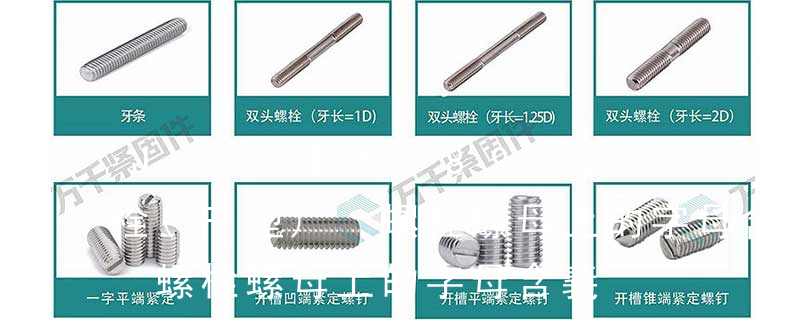 螺母依據屬性主要有國標(GB)、德標(DIN)、國際標準(ISO)、日標(JIS)、美標(ASTM/ANSI)等標準。其中、國標、德標、日標用M表示(例如M8、M16),美制、英制則用分數或#表示規格(如8#、10#、1/4、3/8)。螺母 1. 螺栓:由頭部和螺桿(帶有外螺紋的圓柱體)兩部分組成的一類緊固件,需與螺母配合,用于緊固連接兩個帶有通孔的零件。這種連接形式稱螺栓連接。如把螺母從螺栓上旋下,有可以使這兩個零件分開,故螺栓連接是屬于可拆卸連接。 2. 螺柱: